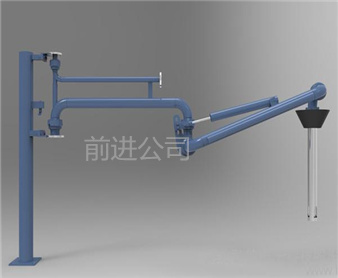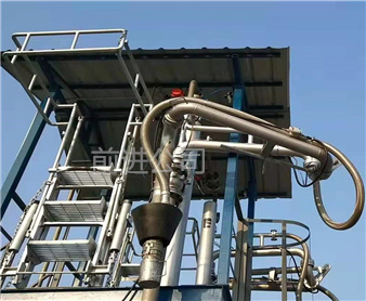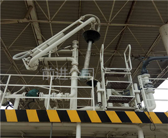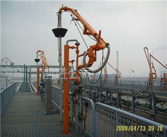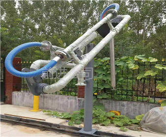 密閉式頂部裝卸臂由5個旋轉(zhuǎn)接組成回轉(zhuǎn)**,液相4個,氣相1個。氣相一般為DN50,液相根據(jù)客戶需要的流量選擇。氣相在轉(zhuǎn)接處使用金屬軟管連接,保證鶴管的旋轉(zhuǎn)靈活性。鶴管液相接口朝下,氣相接口朝上,一般氣相會多臺匯總在一個主管上,如果單臺排空的話,需要加帶雨帽的阻火器,**管道進入點燃源。垂管上有一個錐形密封帽,裝車時垂管插到槽車的頂部灌口,密封帽壓實在灌口處,鎖緊外臂鎖緊桿(或者氣缸壓緊,在和油氣回收配合使用時,建議鶴管增加氣缸,達到充分密閉的作用,因為空的槽車在裝車時物料逐漸增多,槽車輪胎壓扁,槽車降低,密封帽就不能很好的密封了,必須有氣缸對密封帽有一個壓力,才能使密封帽始終跟緊灌口。達到有效密閉的效果,油氣回收需要密閉效果達到90%-95%)密封帽密閉后,槽車里氣化的介質(zhì)就能通過鶴管上的氣相管道排空或者抽入油氣回收系統(tǒng)